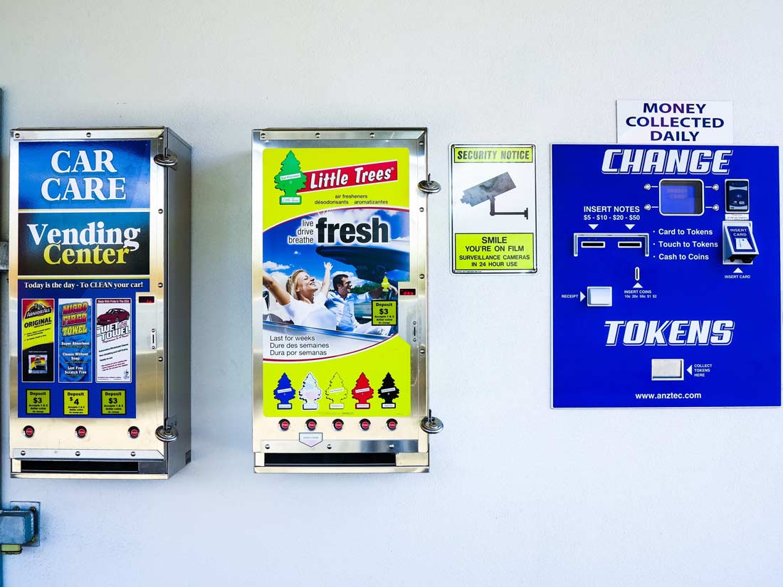 Our vacuum bays are conveniently located under a shady roof and offer powerful suction for the best results. Vacuum bays are also a handy area to chamois your vehicle after using the Touch-free Automatic or wash bay facilities, or to wipe down your interior using our ArmorAll products. Chamois, ArmorAll and more car care merchandise are available from the vending machine located at the plant room, as well as a change machine for your assistance.